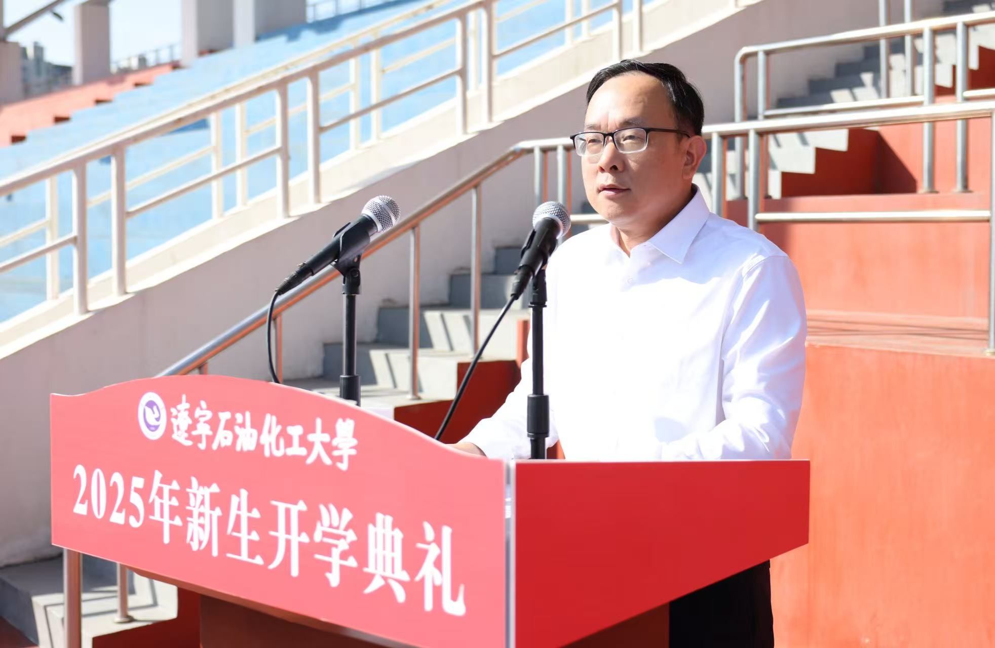 刘坚以《向新而行,在能源报国中书写无悔青春》为题发表了热情洋溢的讲话,他代表学校和全体教职员工,向全体新同学表示最热烈的欢迎,并向一路陪伴学子成长的父母和师长致以崇高敬意。刘坚深情回顾了学校作为新中国第一所石油工业学校75载风雨兼程、与油共进的辉煌历程及其形成的独特“抚油精神”。他着重介绍了学校紧扣国家“双碳”目标和能源安全战略所取得的一系列新发展:三个学科进入ESI全球排名前1%,13个专业入选国家级一流本科专业建设点,多项“卡脖子”技术被攻克并成功应用,正在无畏风雨、坚定迈向建设能源领域特色鲜明的一流高水平应用型大学的目标。面对时代之变、行业之变,刘坚以“新”字为核心,对全体新生提出三点殷切希望:一要涵养“新视野”,胸怀“国之大者”,锚定报国新坐标;二要练就“新本领”,直面行业变革,锻造核心竞争力;三要砥砺“新品格”,锤炼意志品质,展现青春新风貌。他勉励新生以谢在库院士、李万春总工程师、曾飞鹏等杰出校友为榜样,传承“问学穿石、修身诚化”的校训精神,以坚韧、奉献、协作、创新之姿,在波澜壮阔的时代中定义属于自己的青春气象。