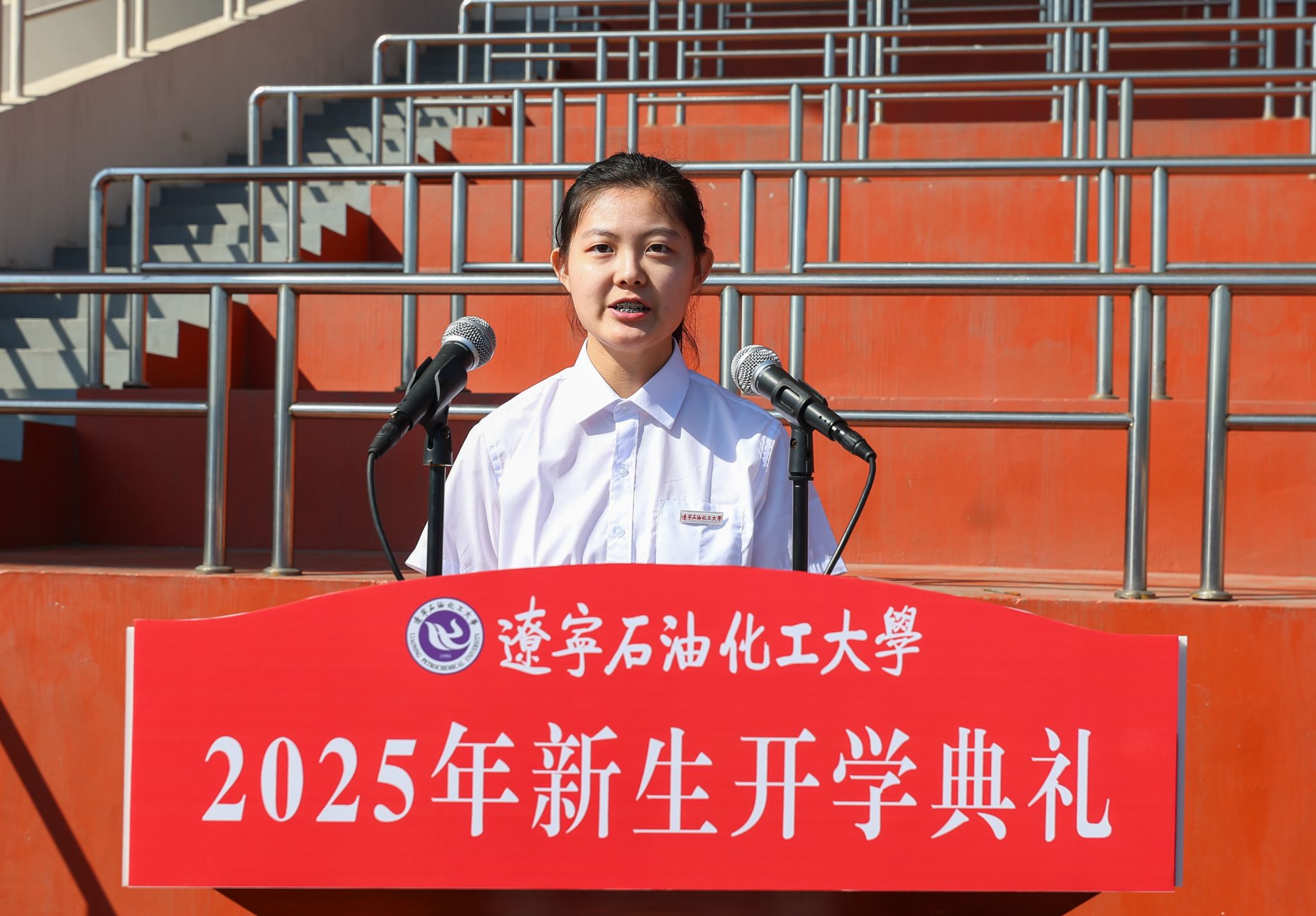 学生代表理学院物理学专业2025级研究生战禹诺、石油化工学院化学工程与工艺(卓越)专业2025级本科生张艺骞依次上台发言。他们表达了对大学生活的美好憧憬和立志成才的决心,表示将不负韶华,以开拓创新为笔、奋发有为作墨,续写辽石化大的辉煌篇章。